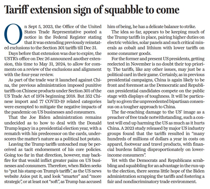 2018年,当时的特朗普政府以“国家安全”之名援引“301条款”(美国《1974年贸易法》第301条),对中国输美商品加征惩罚性关税。曾经严厉抨击特朗普关税政策的拜登上台后,新瓶装旧酒,换汤不换药,大体保留了特朗普政府对中国商品加征的关税。