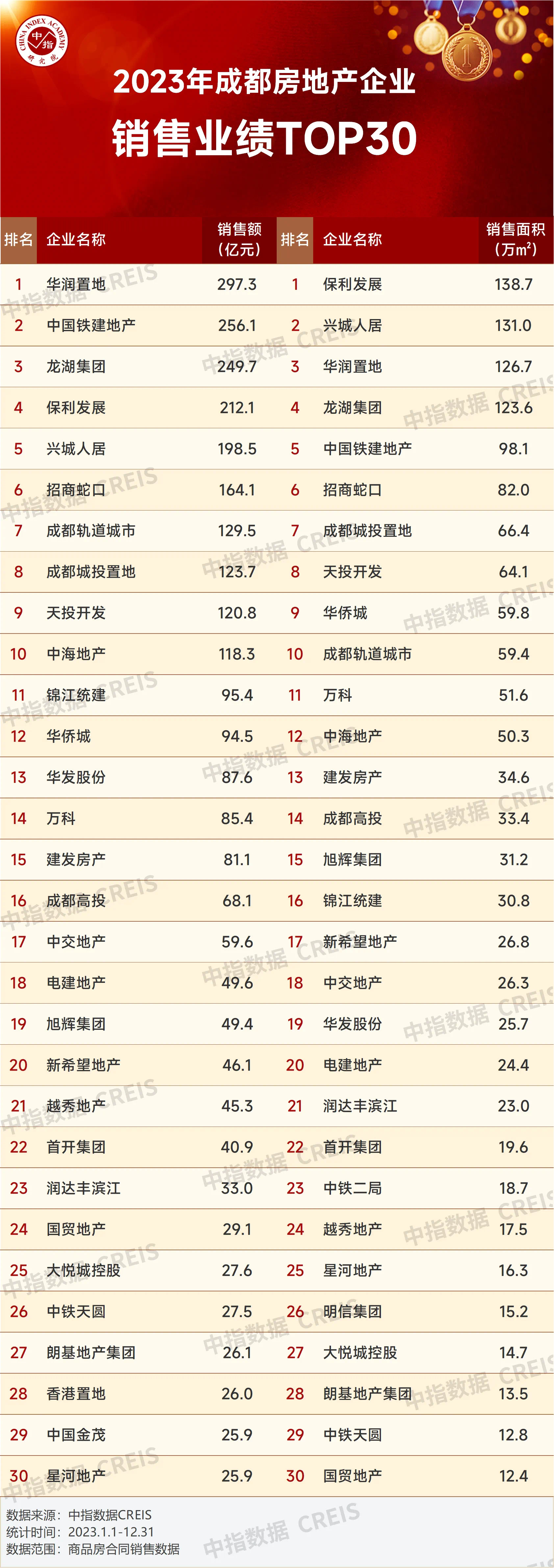 2023年成都房地产企业销售业绩TOP30。图据中指研究院