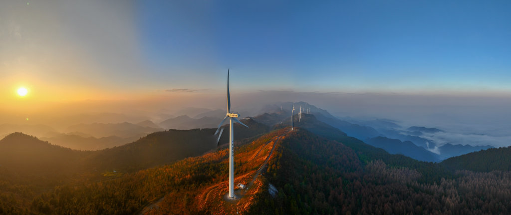 这是1月10日在千野草场景区拍摄的风力发电机组(无人机全景照片)。