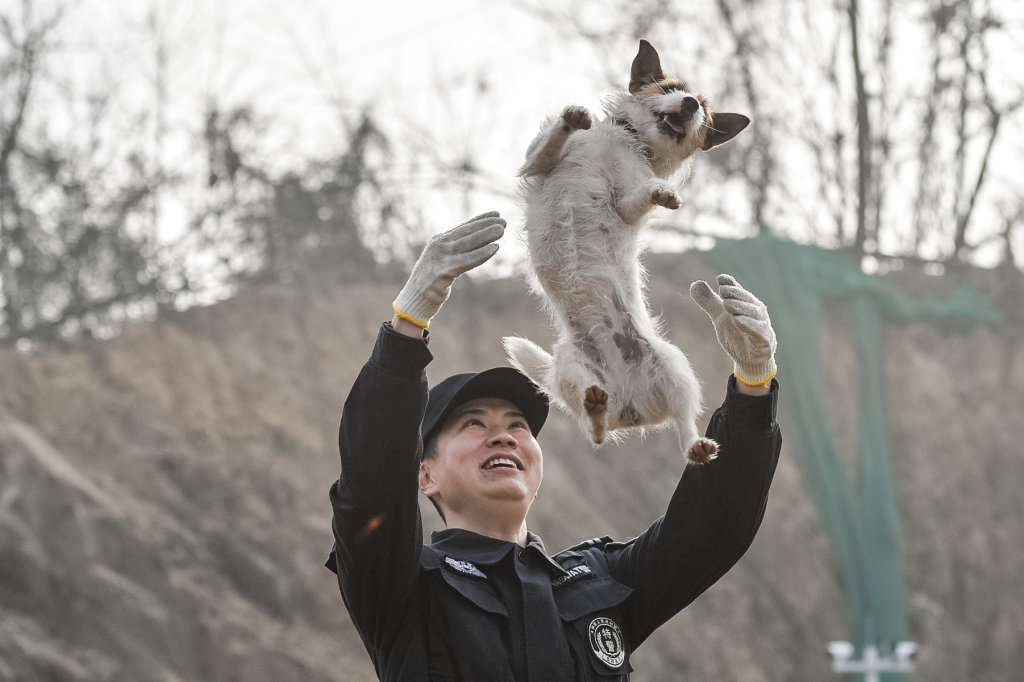 1月10日,训导员和警犬“杰克”在训练间隙玩耍。