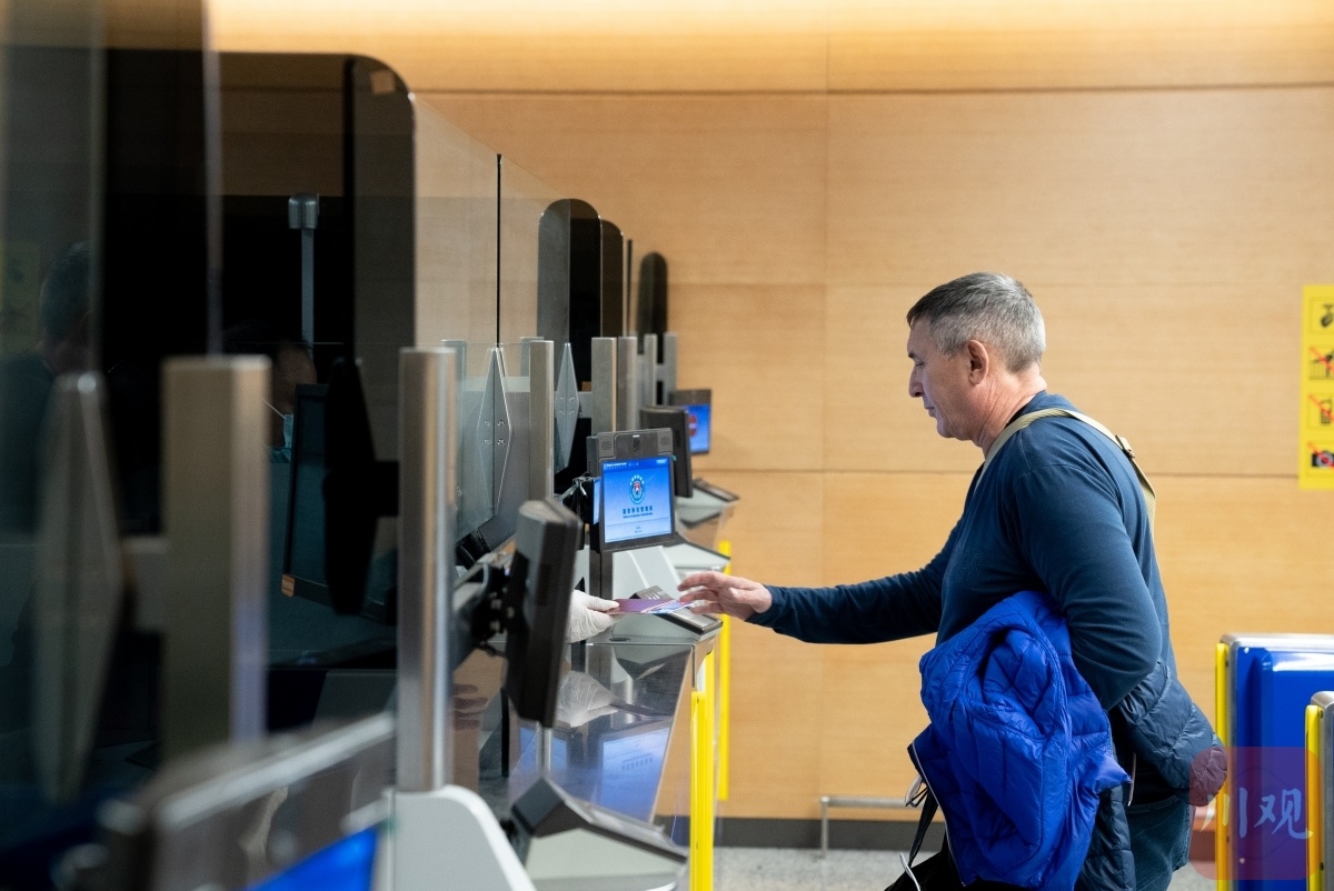 川观新闻记者注意到,该区域的安检、边检点位相距仅数米,设有2条安检通道,3个边检岗亭、6条边检通道。通道虽然不少,但因为同一航班抵达的中转旅客多,旅客排起了队。边检台前,用印有“中国移民管理”字样的隔离带划分出灵活的区域,以方便旅客有序排队、等待通行。一名旅客经过边检出境,大约排行半小时左右。