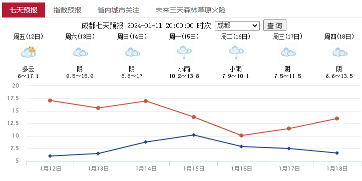 今年四川为什么格外暖和?1月11日,四川省气象台首席预报员肖红茹告诉记者,从近期的天气来说,影响四川的冷空气比较弱,主体冷空气影响地区在我国偏北偏东。从大气环流形势来看,四川从1月2日开始一直是多云或多云间晴的天气,尤其是成都,气温持续往上走。