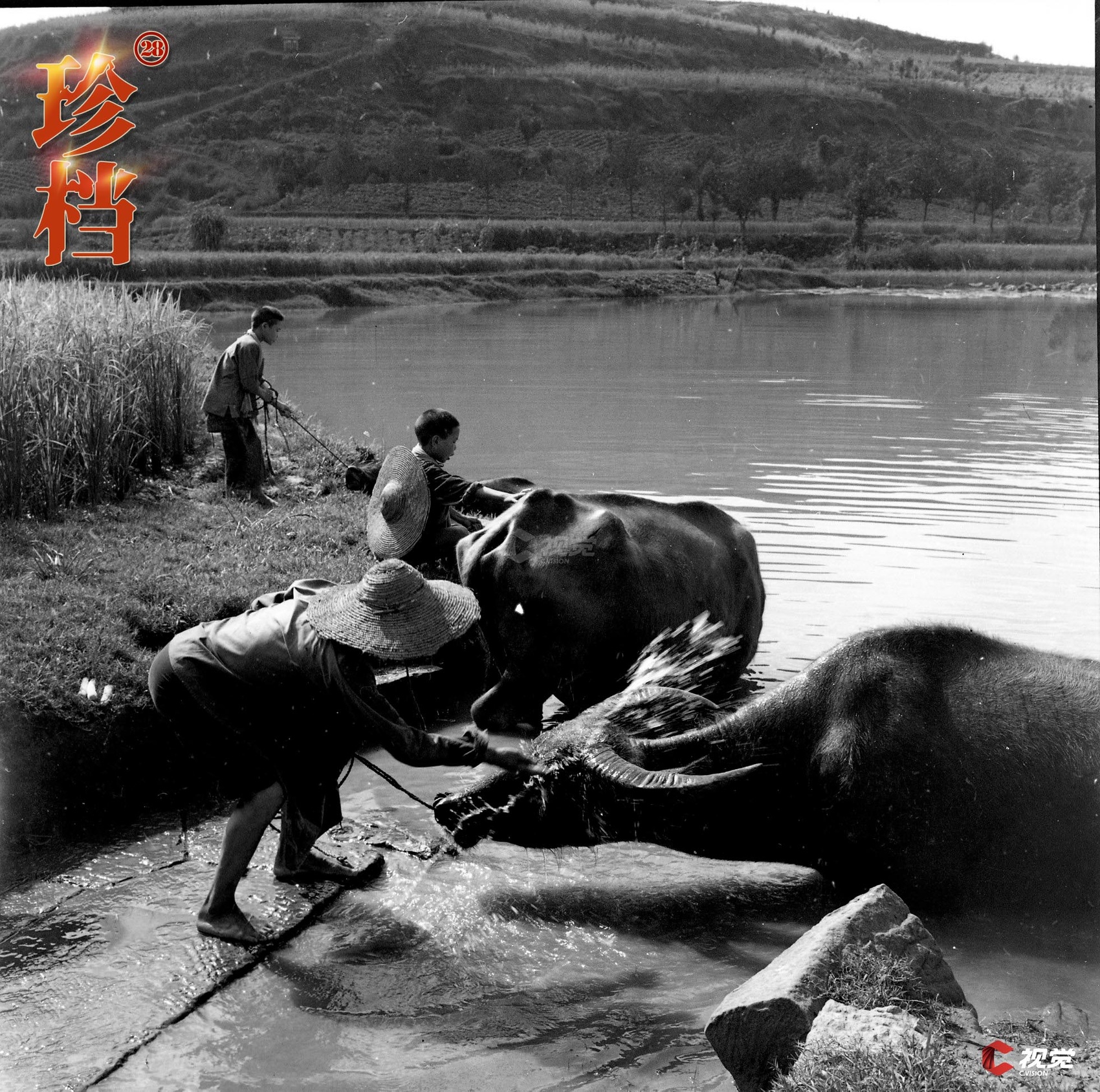 1962年8月,资阳县付家公社的饲养员们在秋耕前的耕牛评比会前给耕牛洗澡。 李煊 摄