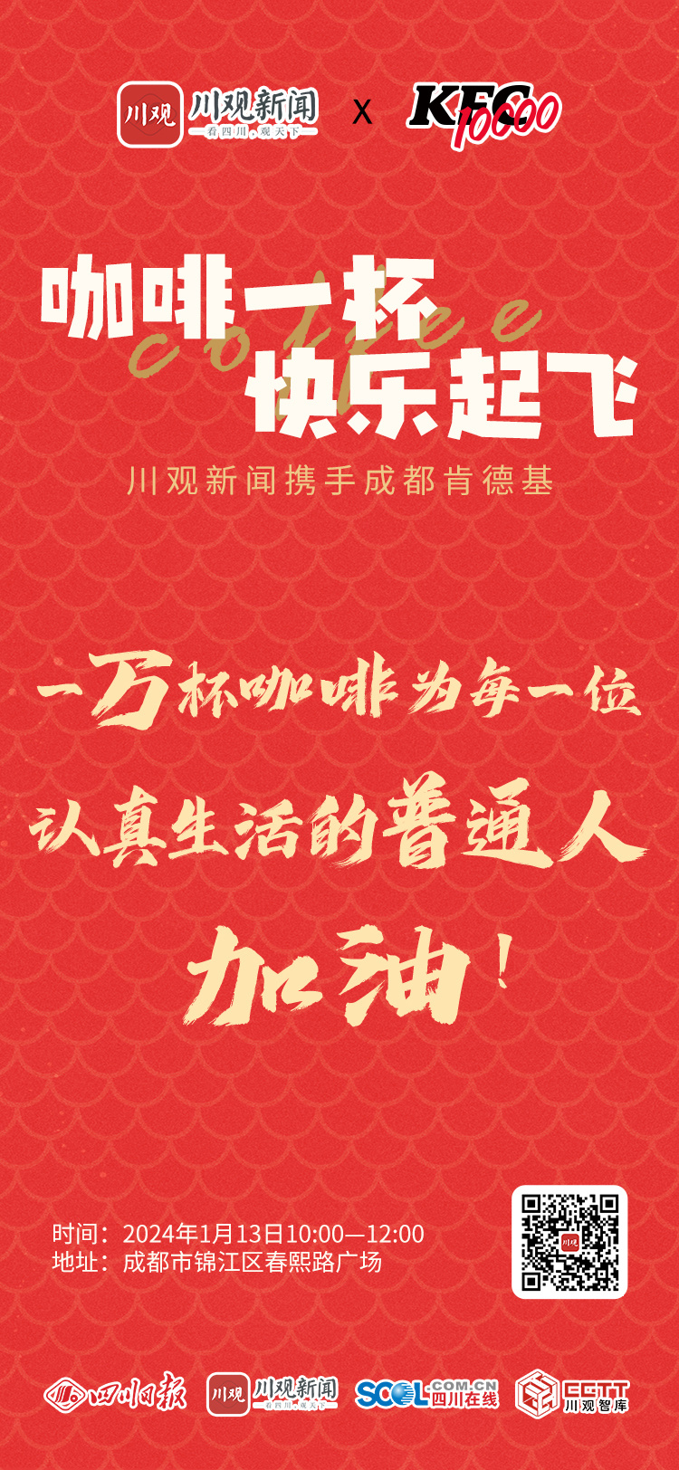 1月13日,川观新闻联合肯德基“万店同庆”成都站品牌体验活动,将在春熙路广场进行,一杯咖啡,为每一个普通人的2024加油助力。