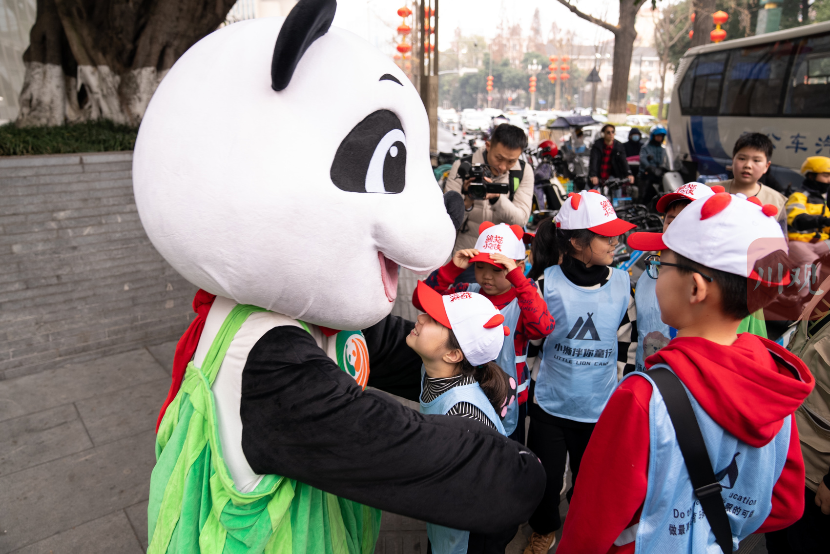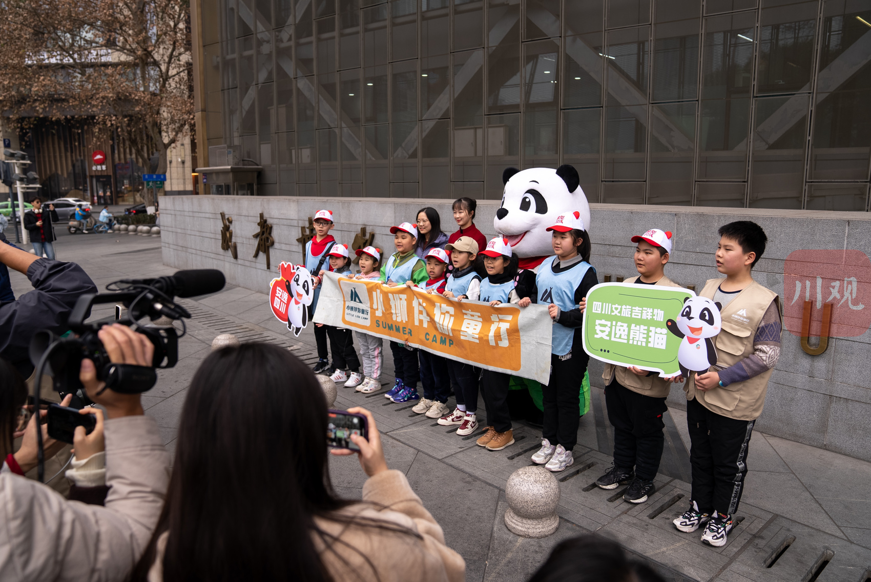 哈尔滨“小东北虎”们跟四川文旅吉祥物“安逸”在成都博物馆前合影