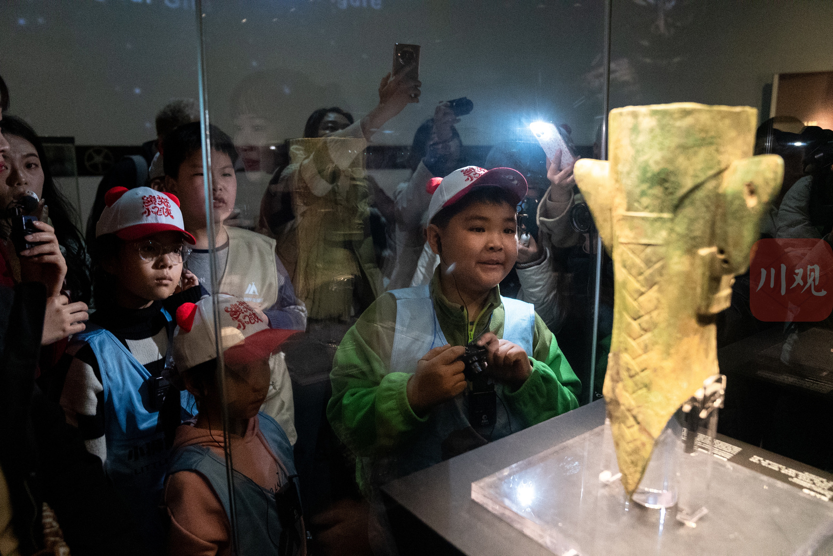 “小东北虎”在博物馆内观赏青铜人头像