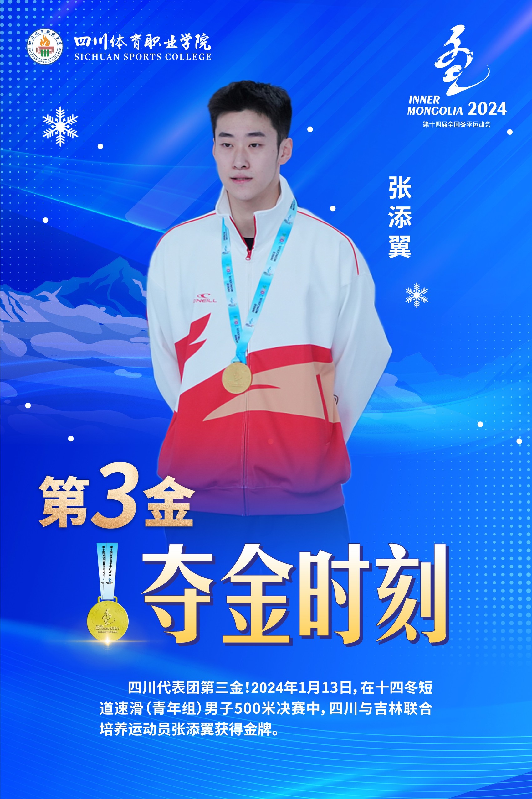 1月13日,第十四届全国冬季运动会短道速滑(青年组)比赛继续在内蒙古冰上运动训练中心短道花样馆进行。在男子500米决赛中,四川队与吉林队联合培养选手张添翼发挥出色,以41秒274的成绩夺得冠军,为四川体育代表团再添一枚金牌。另一名四川选手李坤以0.001秒的劣势屈居第二。