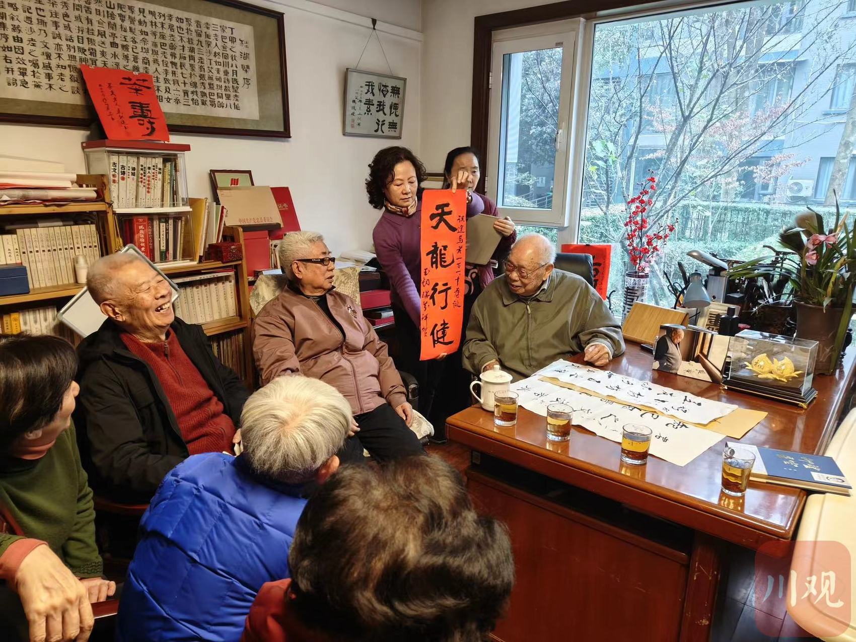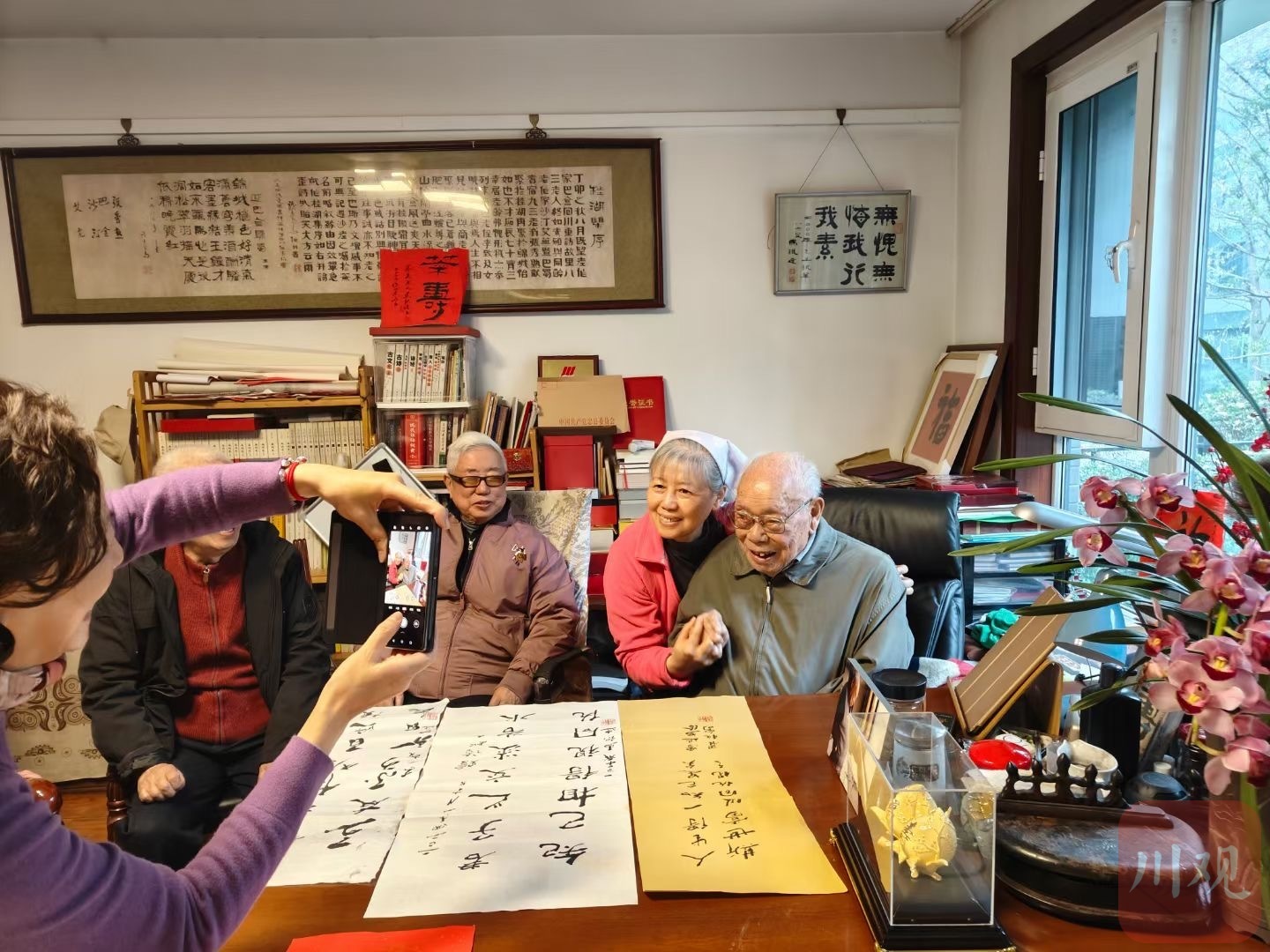 老友们纷至沓来,马老开心不已,挥毫泼墨写下:“赠诸知己 君子之交淡若水,知己相得视同怀。”众人一字一句念出,掌声四起。席间,众人还拿出了马老老家重庆忠县发来的贺信,将美好的祝福转述给马老;17年前聘任马老为“阆中荣誉市民”的阆中市也发来了贺信,追忆马老对一座城市的关怀,感念马老的深情厚谊……马老认认真真地倾听,连说:“好,好,谢谢。”