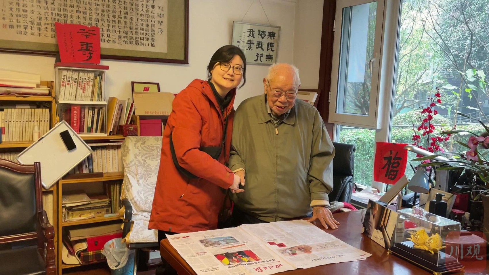 当记者将当天的《四川日报》送到马老手中,马老激动地打开报纸,一眼就看到了最大的标题《马老,110岁生日快乐》,当即乐开了花。拿起放大镜,一排一排地仔细阅读,开心地说道:“感谢四川日报,还给我整了这么大一版啊!做得好!写得好!”在记者未到之前,马老与好友们就已经在网上阅读了这篇稿子,都点赞真情实感,十分动人。记者带去的《四川日报》,马老亲自留下一份,郑重地打开放在书桌上,多余的几份被好友们一抢而空,大家都说一定要留下这份珍贵的记忆。