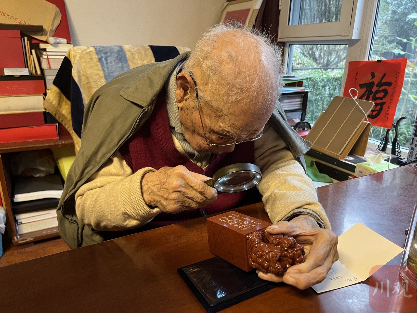 马老回到家,小憩了一会儿之后,起身到书房开始研究四川人民出版社送来的一方印“守朴归真”。整方印,采用的是九叠篆宋代官印形式,马老拿着放大镜,带着记者一个字一个字地辨认,看了半天,他笑着说:“这个篆得太多了,一层一层的,还差点认不出来。”再看了一会儿,马老说:“嗯,看出来了。这个归字,还是繁体的歸。”