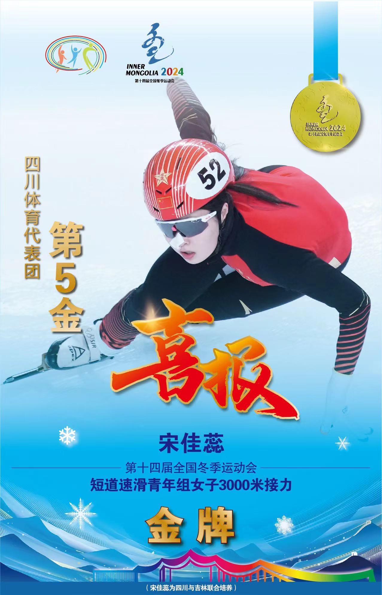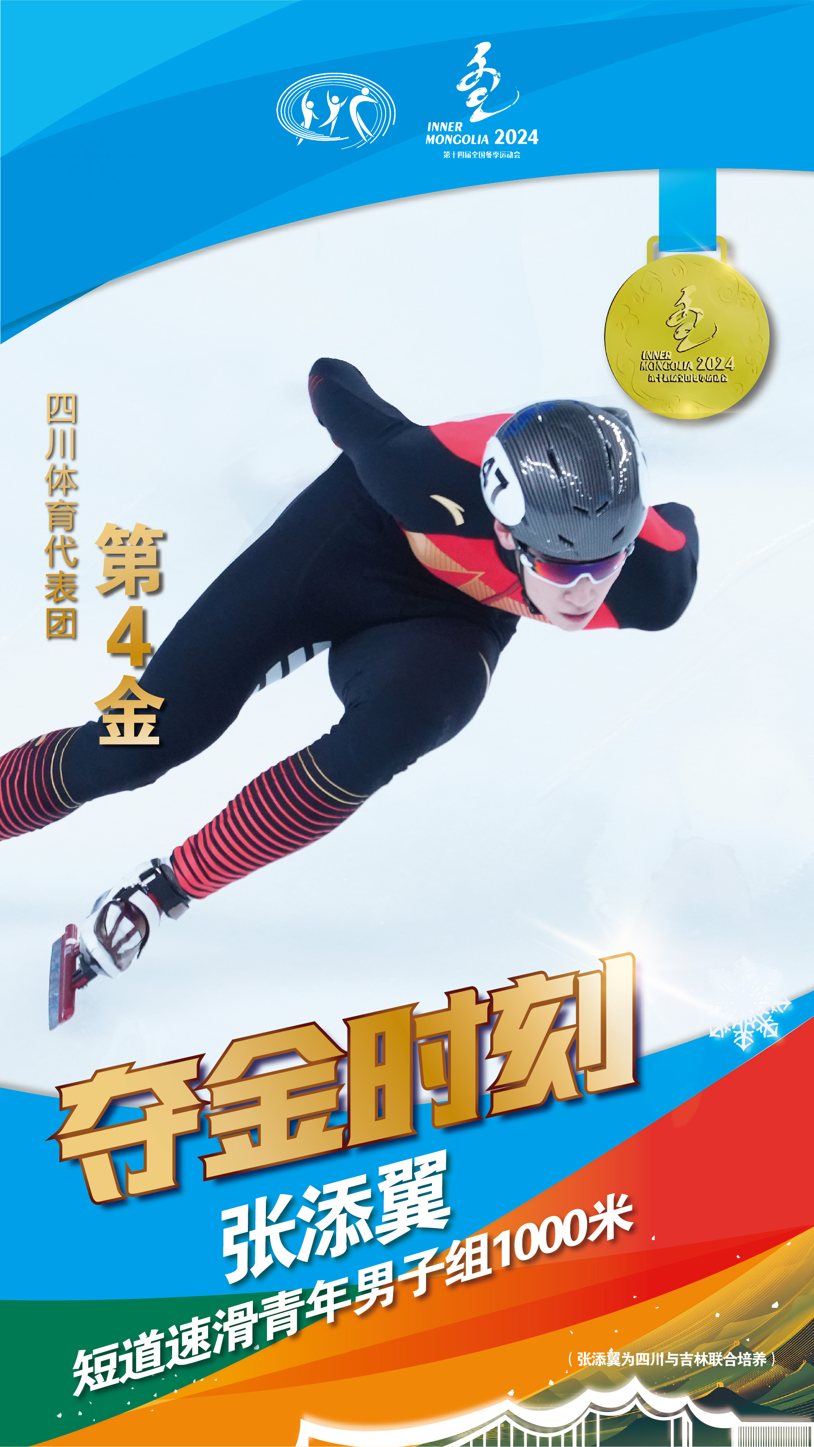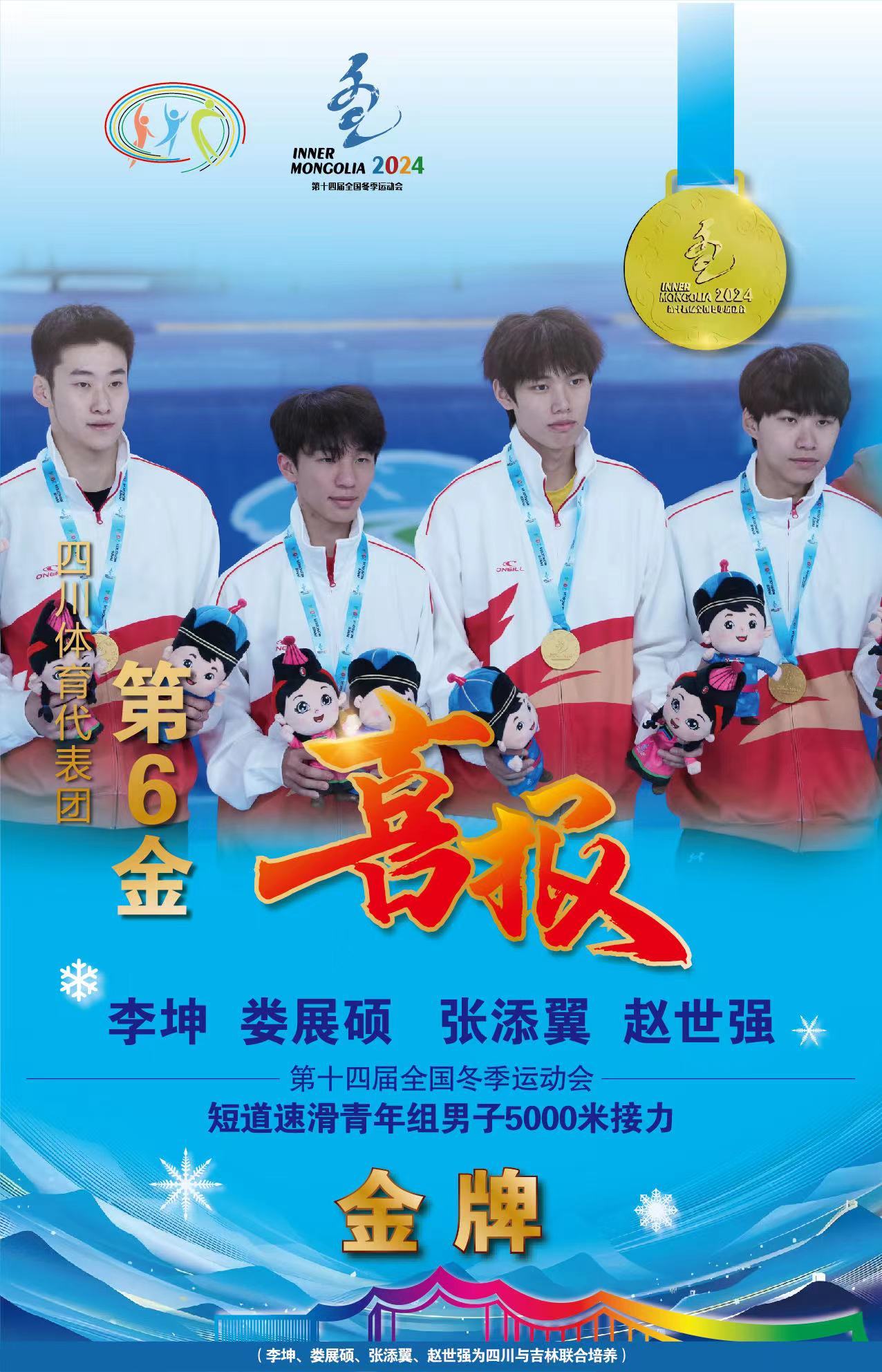 1月14日,第十四届全国冬季运动会短道速滑(青年组)比赛在内蒙古冰上运动训练中心短道花样馆落下帷幕。在最后4个比赛项目中,四川选手表现不错:张添翼、李坤、宋佳蕊先后在男子1000米、女子3000米接力、男子5000米接力三个项目上拿到第一名,为四川体育代表团再添三枚金牌,也使得四川体育代表团在本届全国冬季运动会上的金牌数量达到了6枚。