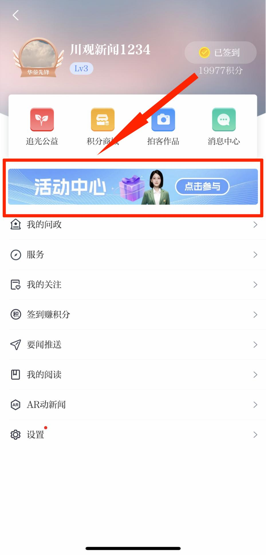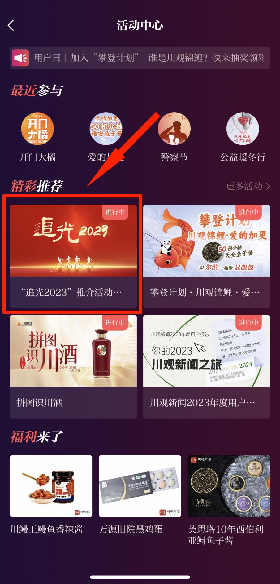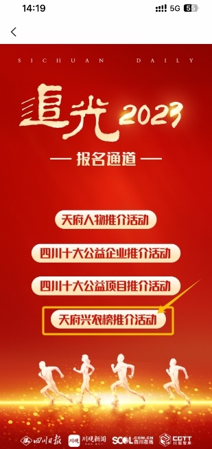 方式二:在川观新闻首页,点击右上角“我的”,点击“活动中心”,找到“‘追光2023’推介活动报名通道”图片,点击“天府兴农榜推介活动”参与报名。