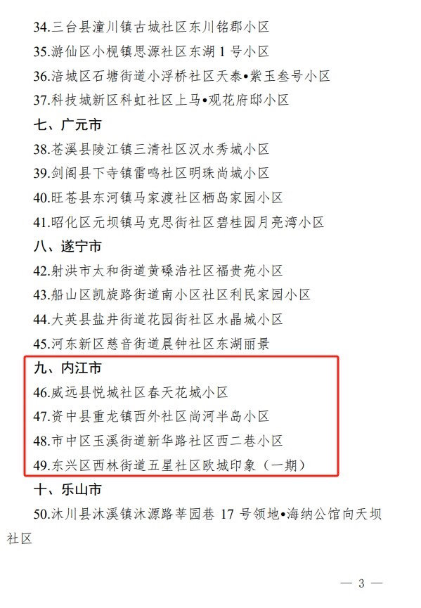 威远县悦城社区春天花城小区、资中县重龙镇西外社区尚河半岛小区、市中区玉溪街道新华路社区西二巷小区、东兴区西林街道五星社区欧城印象(一期)。