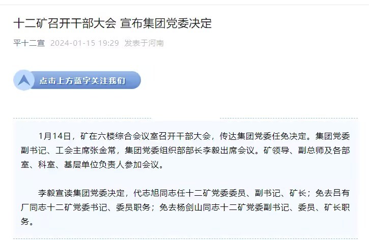 据平顶山天安煤业股份有限公司十二矿官方公众号“平十二宣”消息:经集团党委决定,免去吕有厂十二矿党委书记、委员职务;免去杨剑山十二矿党委副书记、委员、矿长职务。