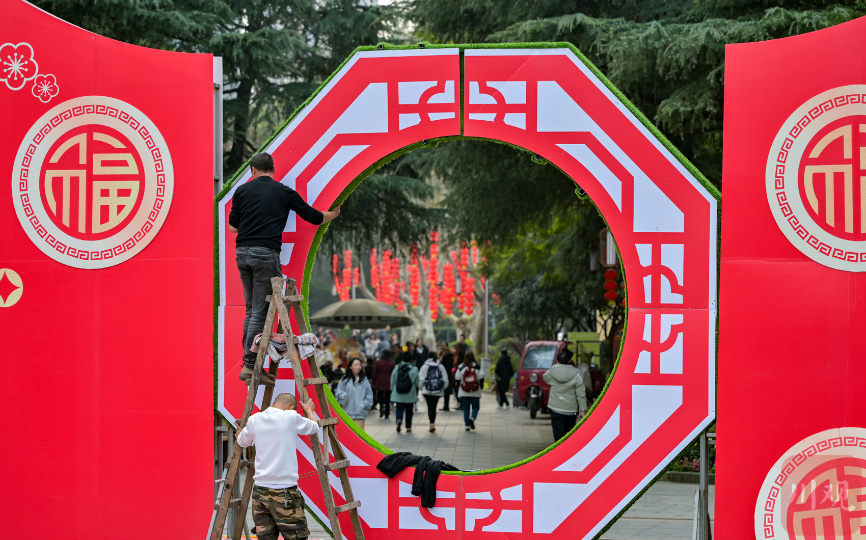 1月15日,成都人民公园内迎接新春的红灯笼挂起,龙年彩灯也正在紧锣密鼓的安装中。随着龙年春节的临近,人民公园通过悬挂红灯笼、设置夜景照明、组摆园林小品、组织特色花展等形式,为市民春节期间休闲游园做足了准备。