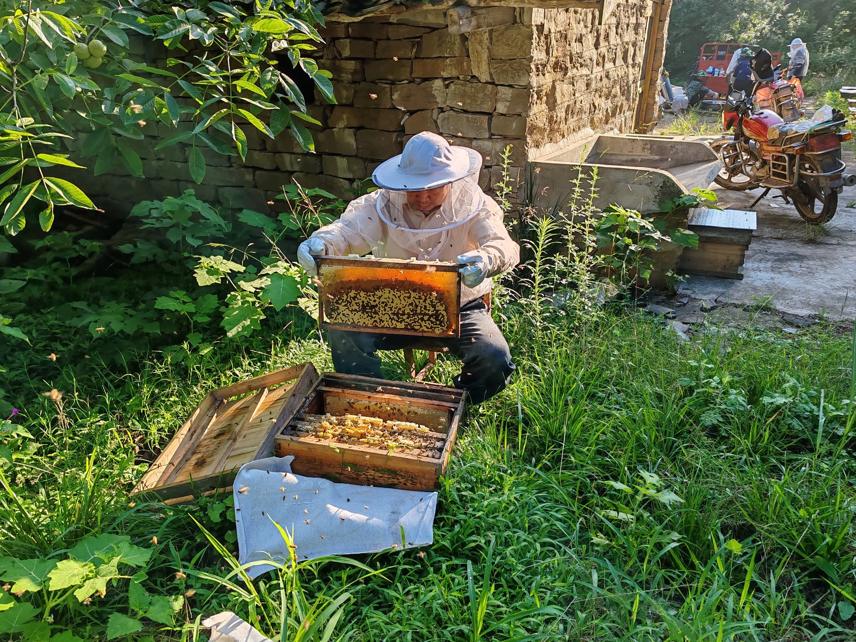 飞凰养蜂农民专业合作社养蜂基地里,工作人员查看蜂脾情况。受访者供图