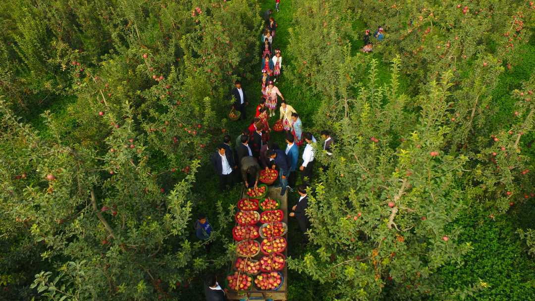 2023年,新疆阿克苏苹果收获季,果园里一派忙碌的丰收景象。王拓摄