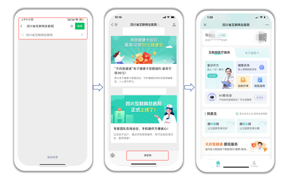 搜索关注“四川省互联网总医院”公众号,点击“微官网”即可进入。