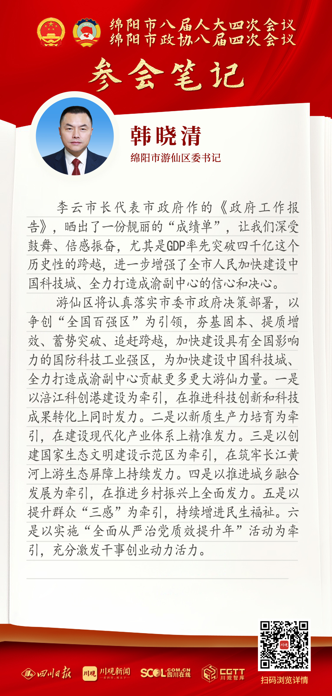 李云市长代表市政府作的《政府工作报告》,晒出了一份靓丽的“成绩单”,让我们深受鼓舞、倍感振奋,尤其是GDP率先突破四千亿这个历史性的跨越,进一步增强了全市人民加快建设中国科技城、全力打造成渝副中心的信心和决心。