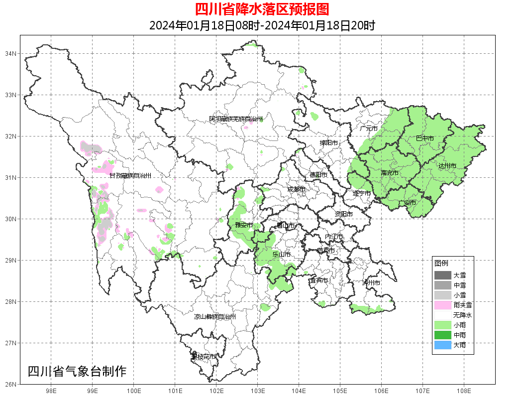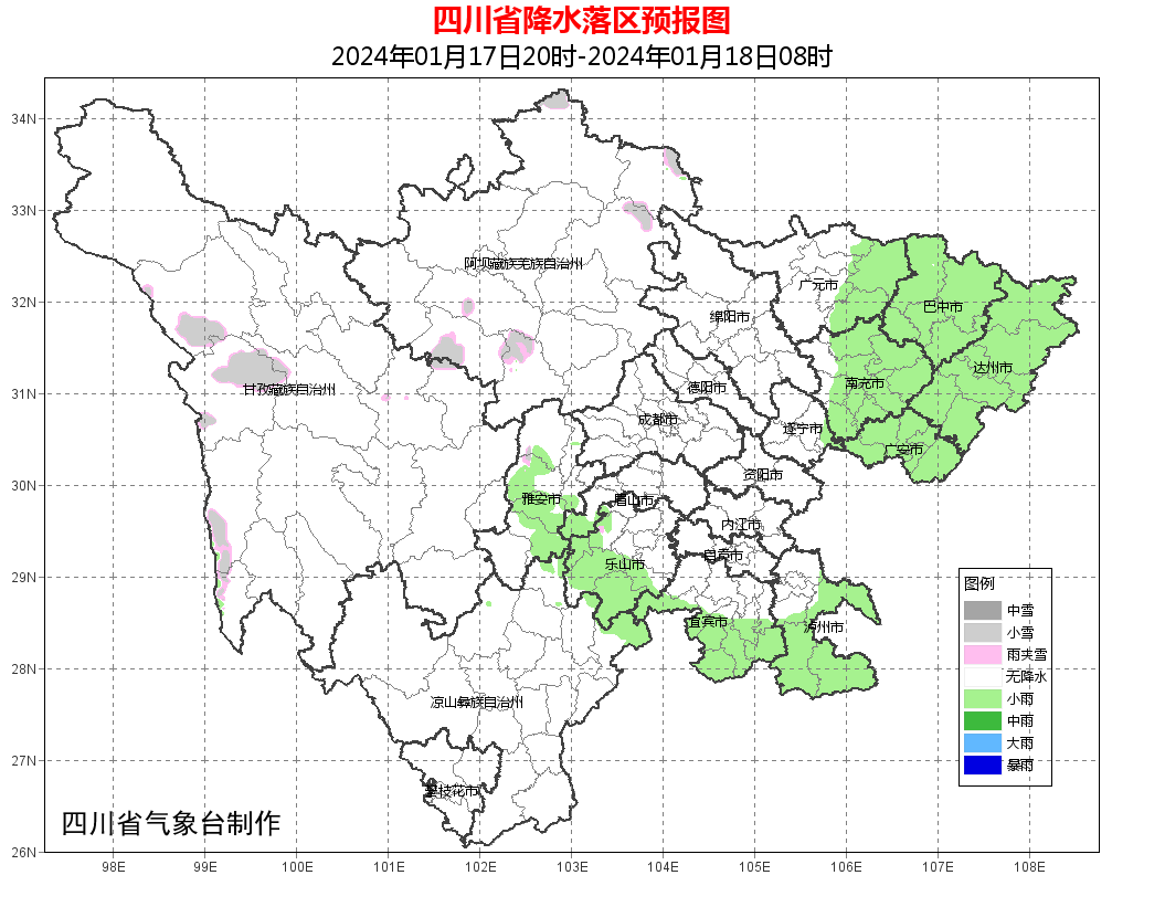 今天晚上:巴中、达州、南充、广安4市和广元东部阴天有小雨,盆地其余地方阴天间多云,南部山区有零星小雨;川西高原多云,局部地方有阵雪(雨),攀西地区大部多云间晴。