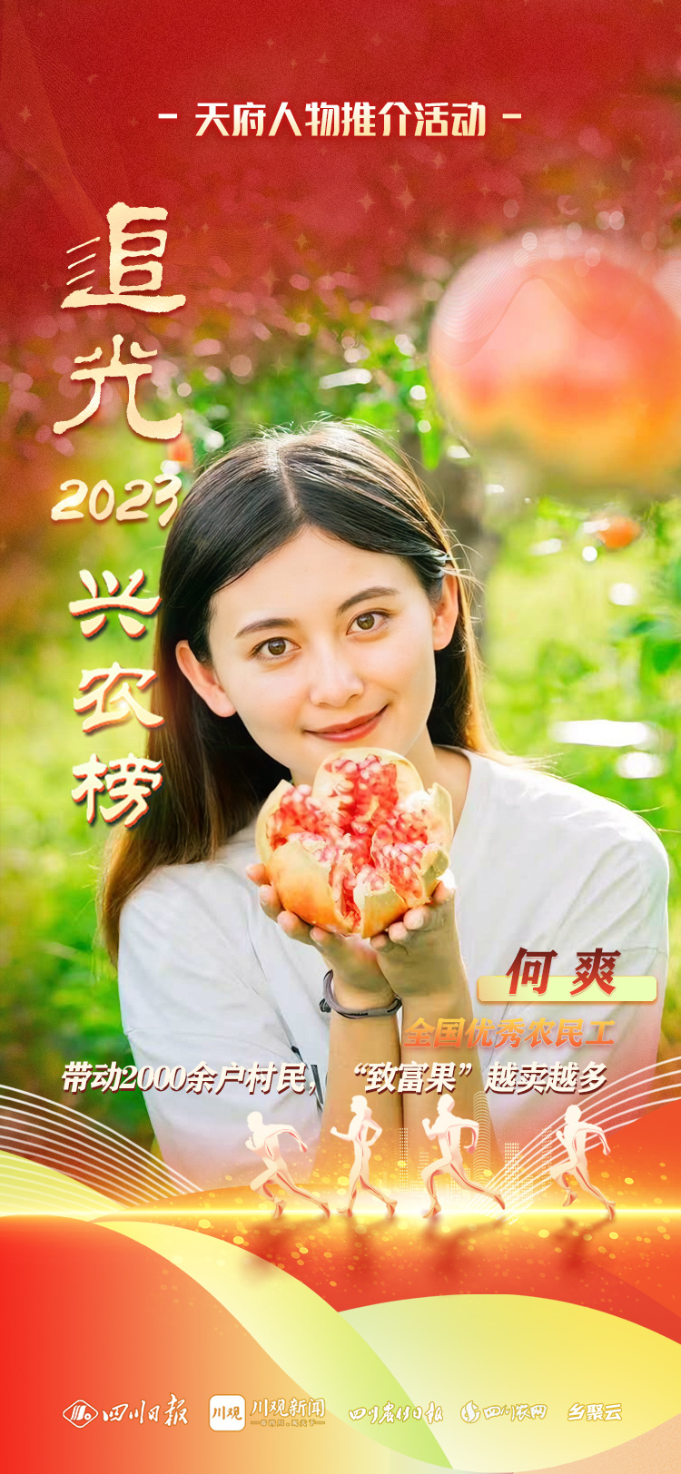由四川日报全媒体主办,全省183个县级融媒体中心联动,四川农村日报、川观智库问稻研究院牵头的“追光2023·天府兴农榜”推介活动启动。全国优秀农民工、四川省第二批农村致富带头人、凉山州菁英计划凉山创业领军人才何爽成为我们首批关注对象。