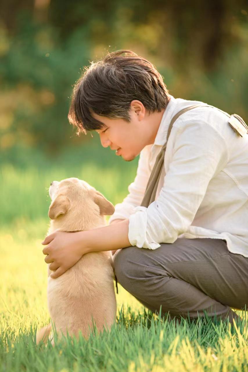 杨兴正在和小狗玩耍。