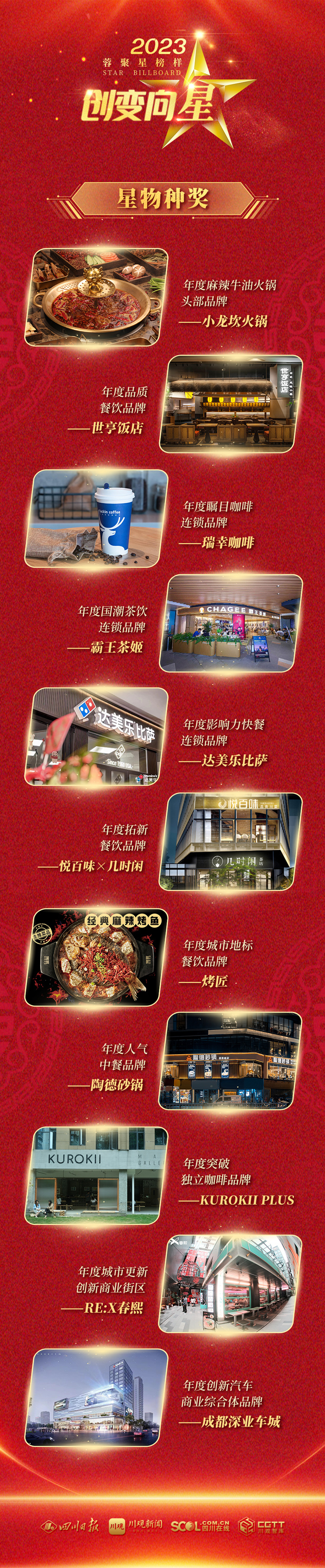 当天的活动现场,“创变向星·2023蓉聚星榜样”年度总评颁奖活动重磅发布“星商业奖”“星物种奖”两大单元榜单,同时向为成都零售商业作出突出贡献的领军人物颁发“星贡献奖”。