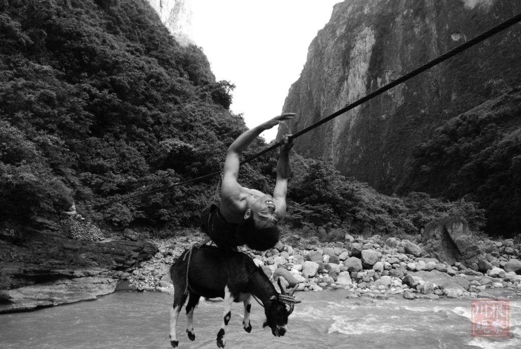 2006年3月21日,凉山州布拖县乌依乡阿布洛哈村,村民带着羊通过溜索过西溪河。林强 摄