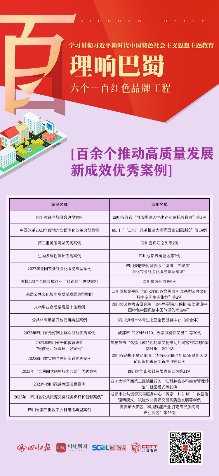 主题教育开展以来,全省党员干部学思想、强党性、重实践、建新功,在改革发展、乡村振兴、生态保护、文化传承等各领域涌现出一批批实现高质量、取得好效果的实践案例。今日,川观新闻精选出16大类,共234个推动高质量发展新成效四川优秀案例,为推动新时代治蜀兴川再上新台阶,奋力谱写中国式现代化四川新篇章树立实践榜样。