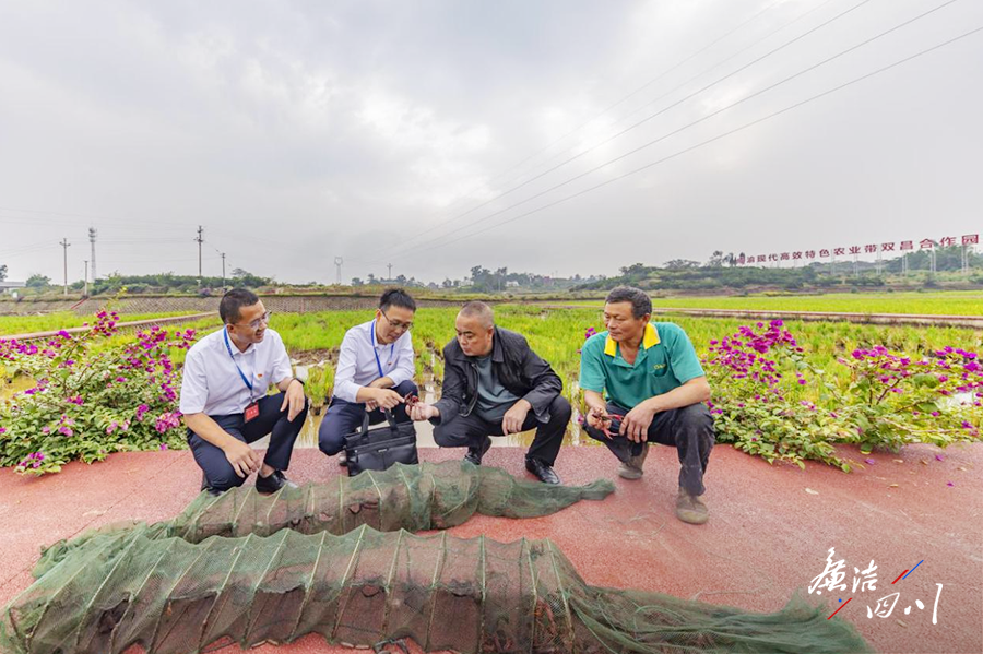 为护航成渝地区双城经济圈建设,内江隆昌市纪委监委与重庆市荣昌区纪委监委共同搭建“联合监督工作站”,围绕项目发包、建设、验收等环节开展交叉式监督。图为两地纪检监察干部到成渝现代高效特色农业带“双昌”合作示范园区,对稻虾产业项目建设资金落地情况开展监督检查。(张春连 摄)