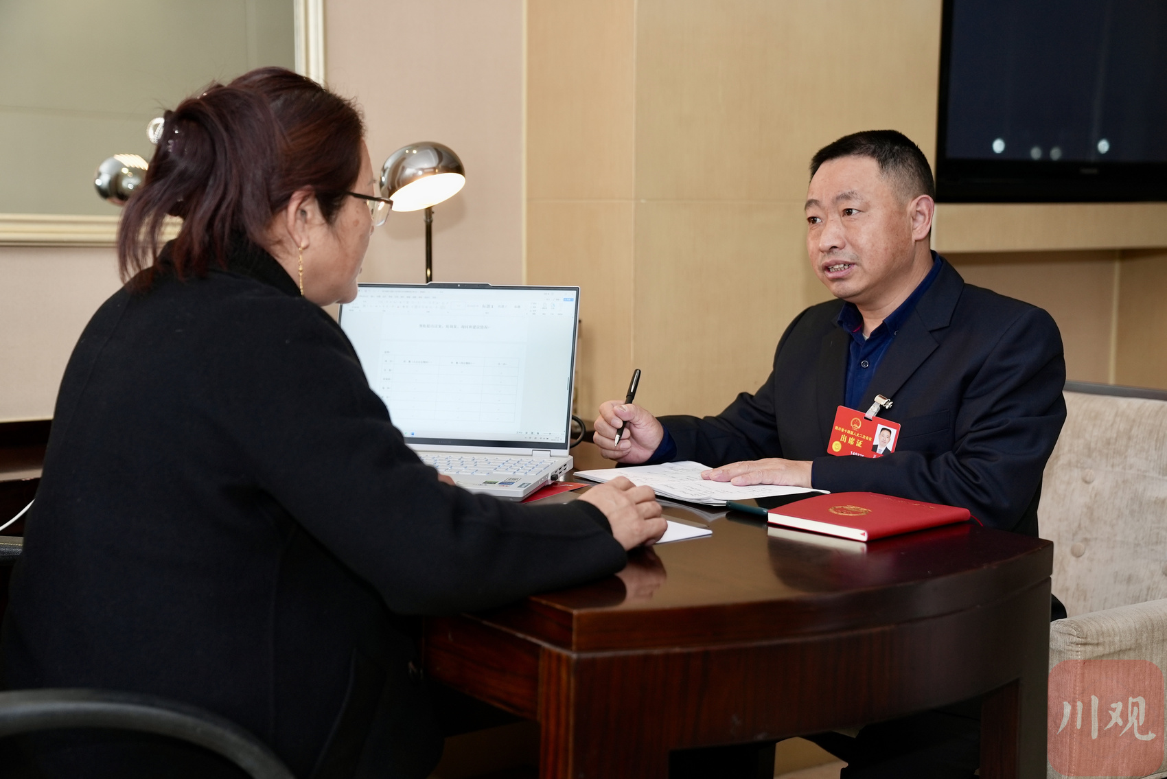 1月20日,在内江代表团驻地,夏凤英代表(左)与肖文华代表(右)刚到驻地就开始进一步讨论完善相关建议。