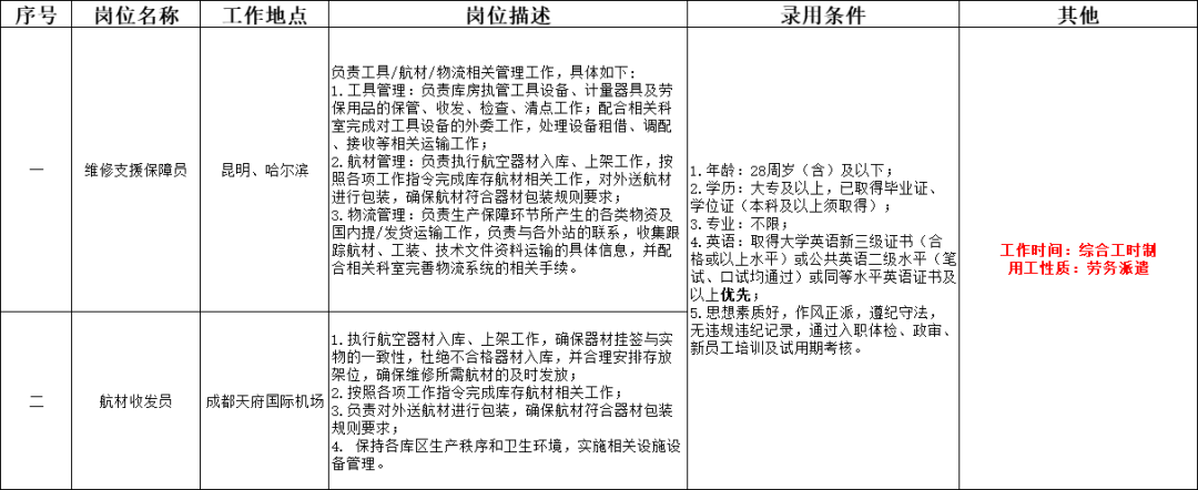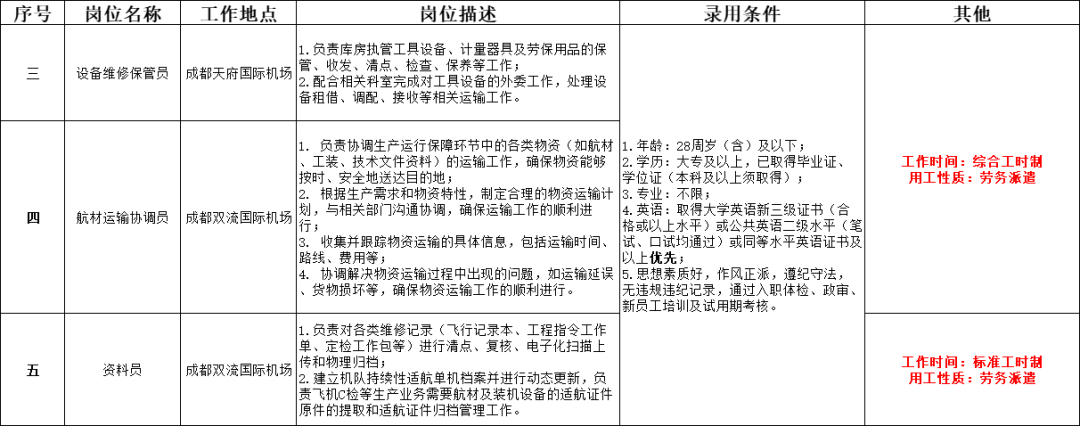 (二)以上岗位与劳务派遣公司签订劳动合同,派遣至四川航空股份有限公司工作,按照新进员工享受公司相应福利待遇;