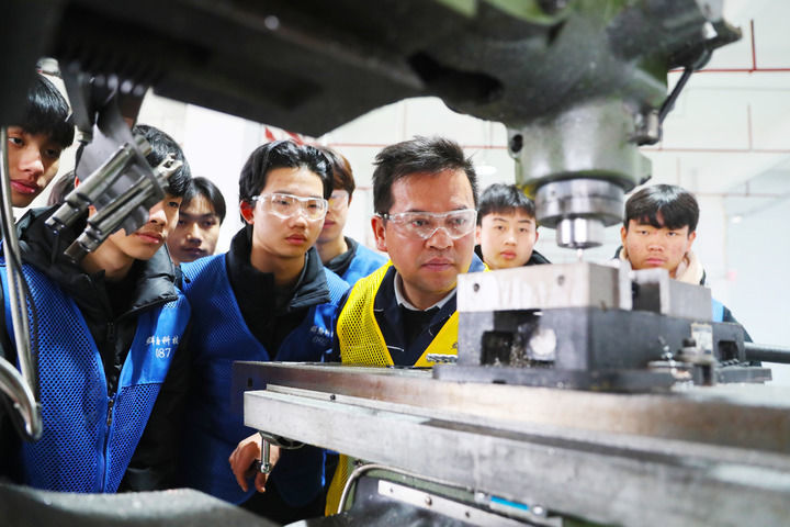 2024年1月9日,在湖南省永州市新田县产业开发区永州群翰科技有限公司车间,新田县职业中等专业学校学生在工厂师傅的指导下学习机床操作技术。近年来,该校联合企业开展“产教融合、校企办学”模式,助推就业创业。新华社发(刘贵雄 摄)