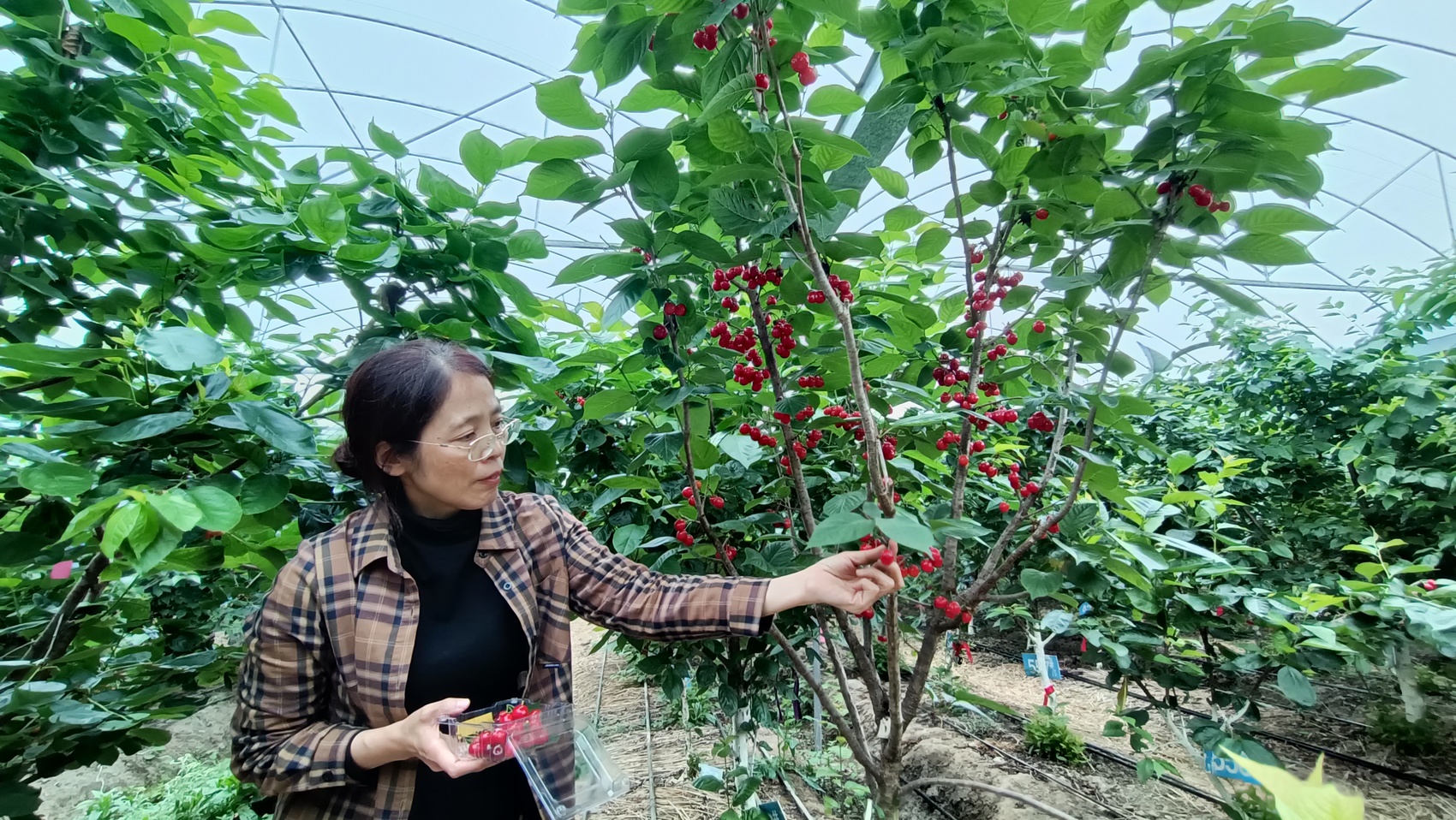 王小蓉在樱桃育种圃采摘樱桃样本。