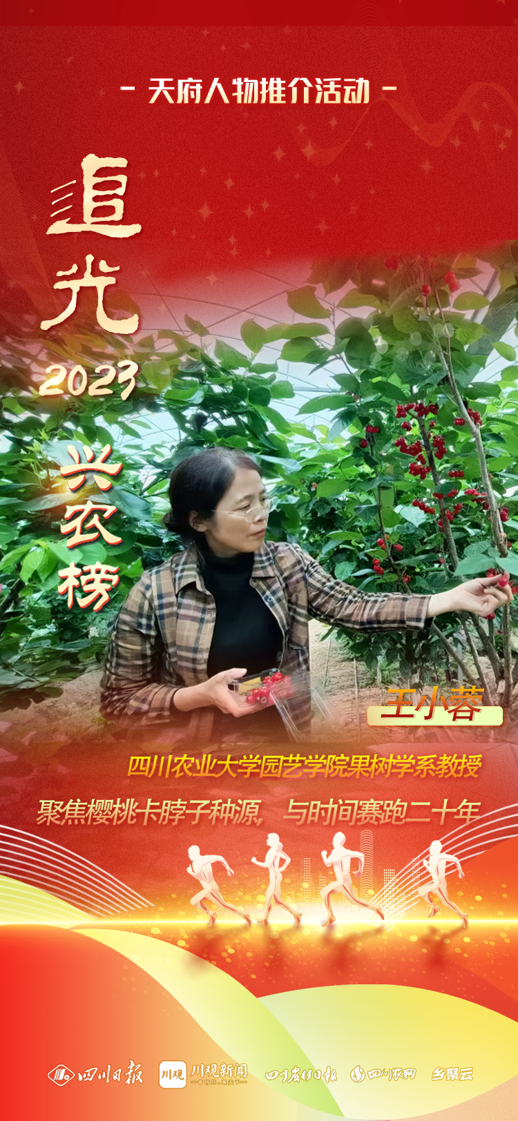 由四川日报全媒体主办,全省183个县级融媒体中心联动,四川农村日报、川观智库问稻研究院牵头的“追光2023·天府兴农榜”推介活动启动。历时20年,带领团队聚焦樱桃种源“卡脖子”问题,实地考察完成我国12省、80余县(市)和110余乡(镇),行程超过20万公里的四川农业大学园艺学院果树学系教授王小蓉成为我们首批关注对象。