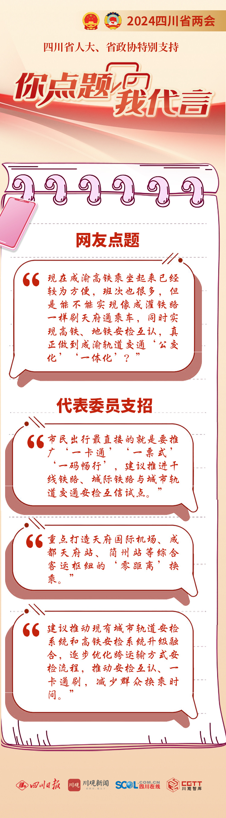 “现在成渝高铁乘坐起来已较为方便,班次也很多,但是能不能实现像成灌铁路一样刷天府通乘车,同时实现高铁、地铁安检互认,真正做到成渝轨道交通‘公交化’‘一体化’?”