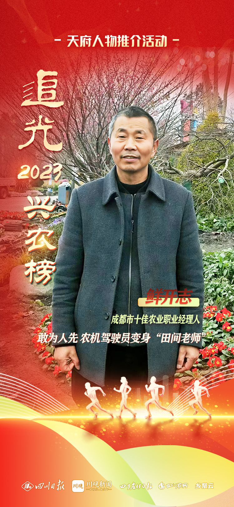 鲜开志,从事农机作业服务、农机推广和新机具实验示范,2015年被评为高级职业经理人,2023年被评为成都市十佳农业职业经理人。其带头成立的成都市温江区开志农机服务专业合作社(以下简称农机合作社)先后被评为“全国农机合作示范社”“四川省级示范社”。