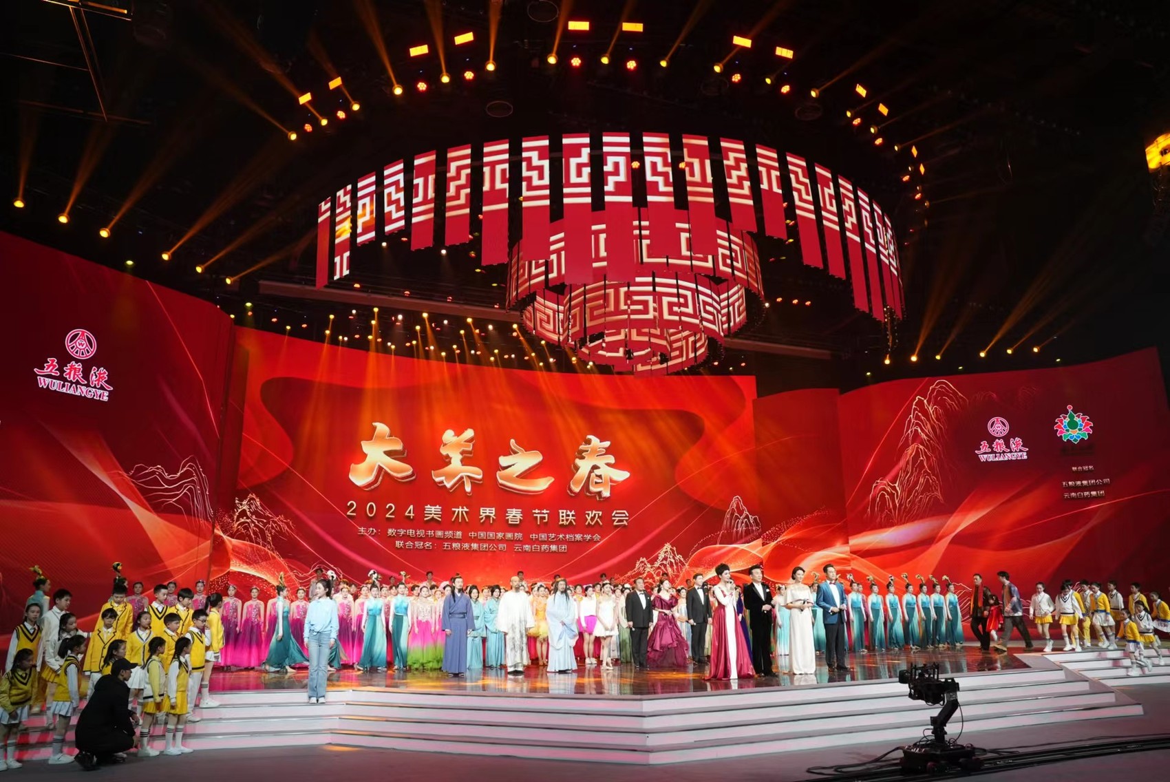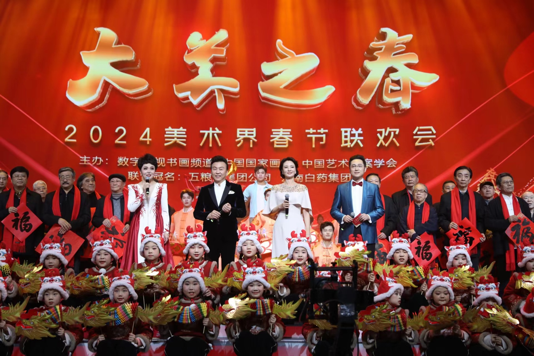 1月20日,由数字电视书画频道、中国国家画院、中国艺术档案学会共同举办,五粮液、云南白药联合冠名的“大美之春”2024美术界春节联欢会在北京举行,全国各大美术机构、国内外知名表演艺术家等1200余人共同欣赏了一场汇聚了歌舞、书画、朗诵、情景剧等众多艺术形式的“美术界春晚”。