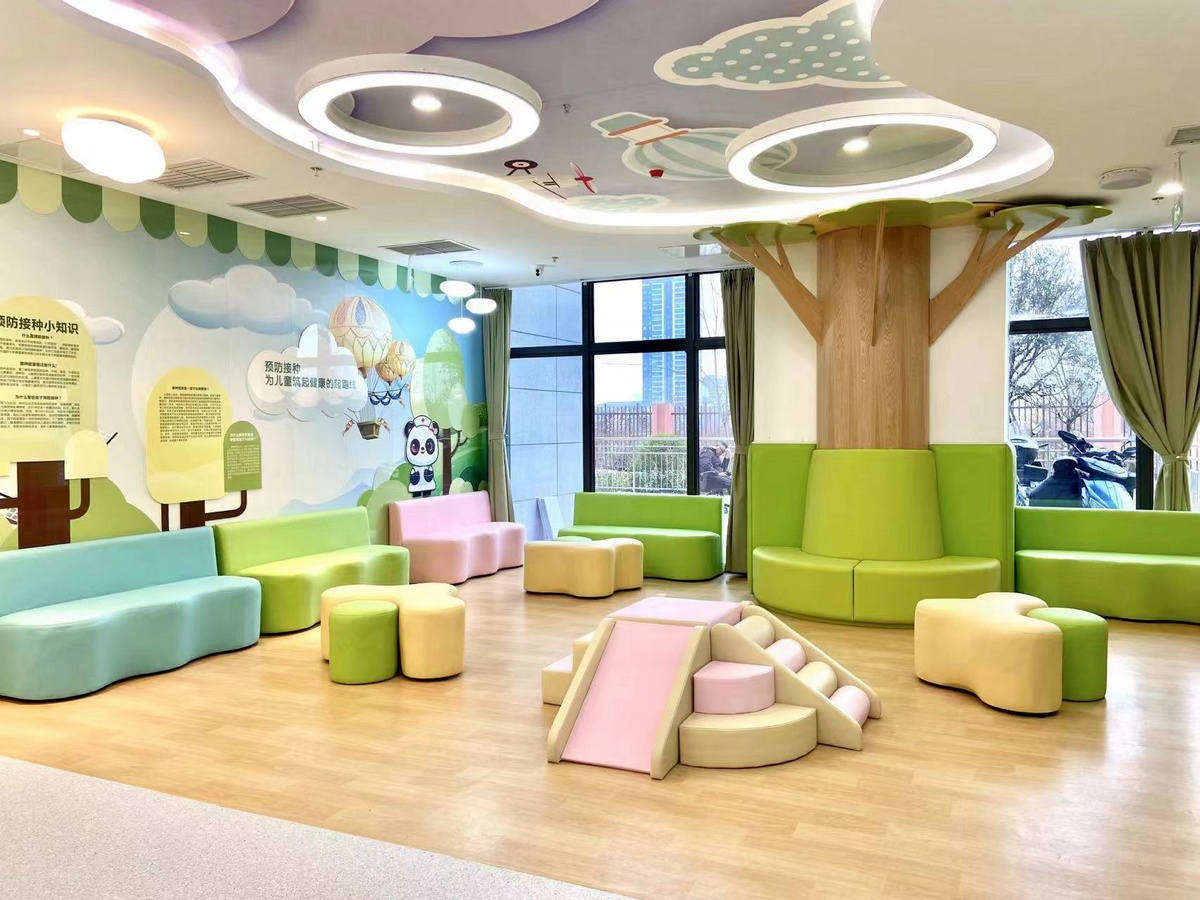 一楼为“环境友好、人文友好、服务友好”的儿童健康管理中心,全方位提供辖区儿童健康服务。该区域以绿色、蓝色为主色调,座椅主要呈弧形、流动造型,打造富有童趣、充满活力的视觉感受,仿佛走进“儿童乐园”。中心负责人介绍,“希望通过打造这样一个温馨愉快的环境,让孩子们不再恐惧来医院。”