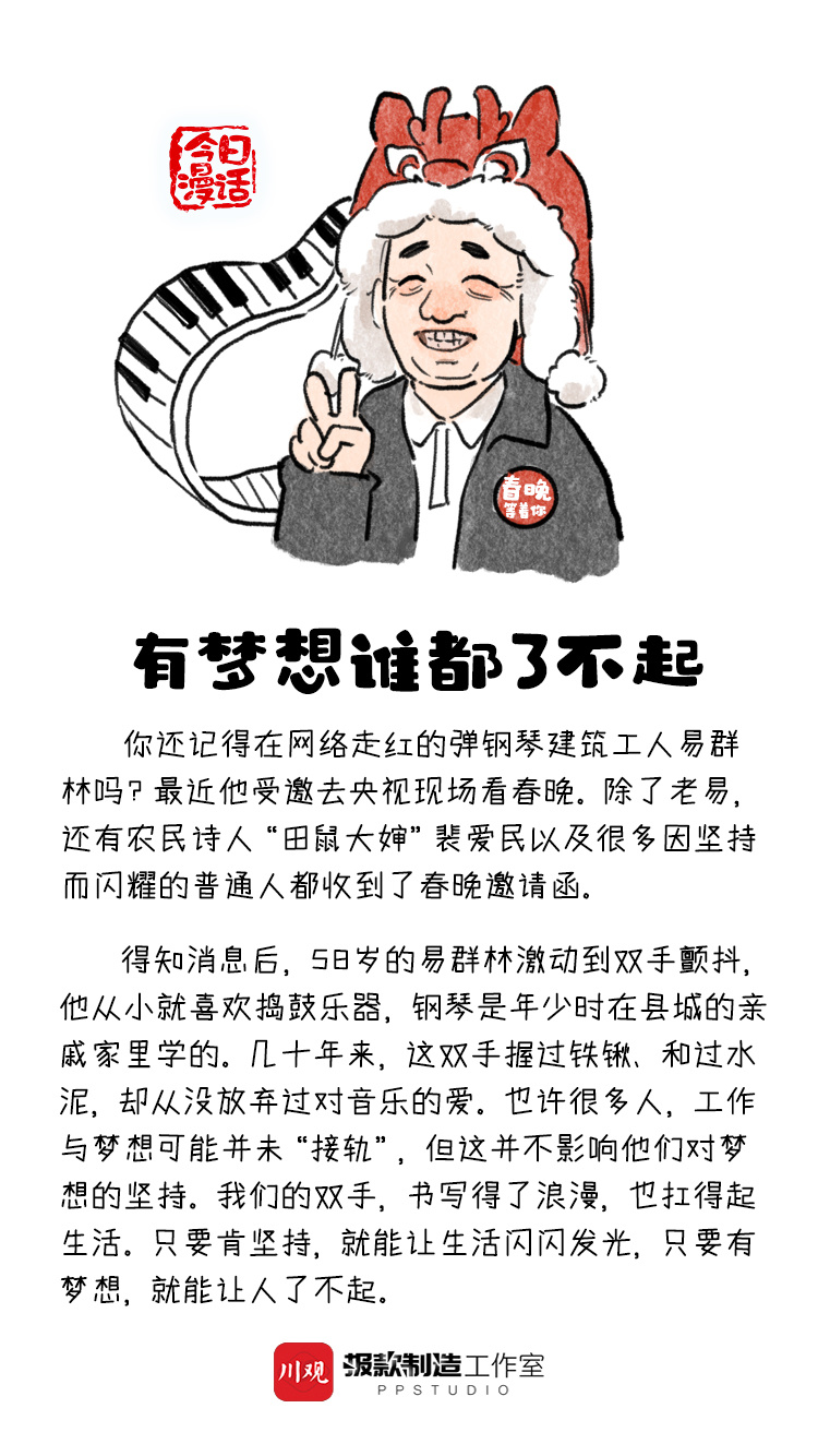 你还记得在网络走红的弹钢琴的建筑工人易群林吗?最近他受邀去现场看春晚。几十年来,易群林的双手握过铁锹、和过水泥,却从没放弃过对音乐的爱。如今,坚持让他闪闪发光。对于弹琴工人大叔去春晚,你怎么看?