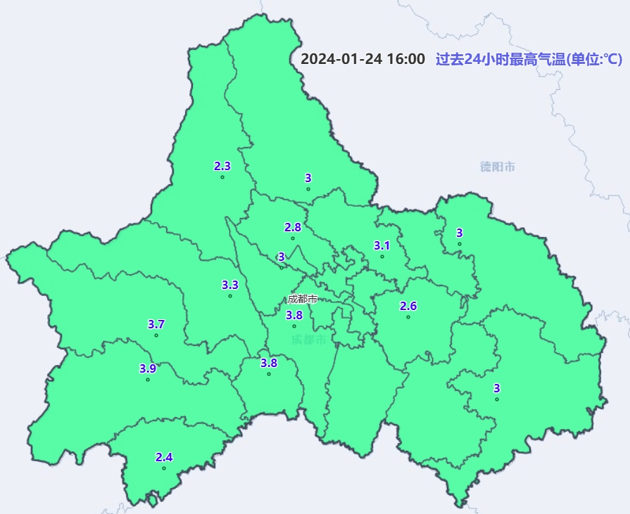 目前成都市各区(市)县均已发布道路结冰黄色预警信号;新津、金堂、新都、邛崃、大邑、简阳、崇州、蒲江、龙泉驿、四川天府新区和温江发布了霜冻蓝色预警信号。
