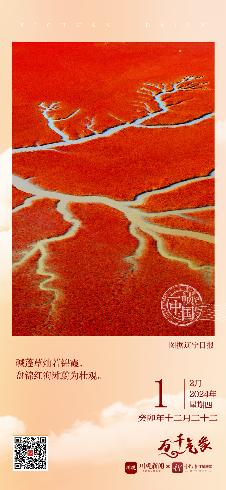 今天的《一帧中国》,川观新闻联合辽宁日报辽望客户端,带您来到辽宁盘锦,图览灿若锦霞的红海滩。