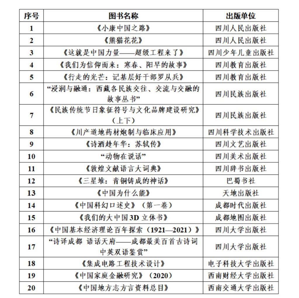 为更好地激励引导全省精品图书出版,近日,经严格审核,四川省新闻出版局公布了“2023四川好书”名单,20种图书入选。《小康中国之路》《这就是中国力量——超级工程来了》《我们为信仰而来:寒春、阳早的故事》《诗酒趁年华:苏轼传》《中国为什么能》和《浸润与融通——西藏各民族交往、交流与交融的故事》丛书等,涵盖了主题出版、文学艺术、人文社科、少儿读物、科普生活等类别,题材丰富,底蕴深厚。