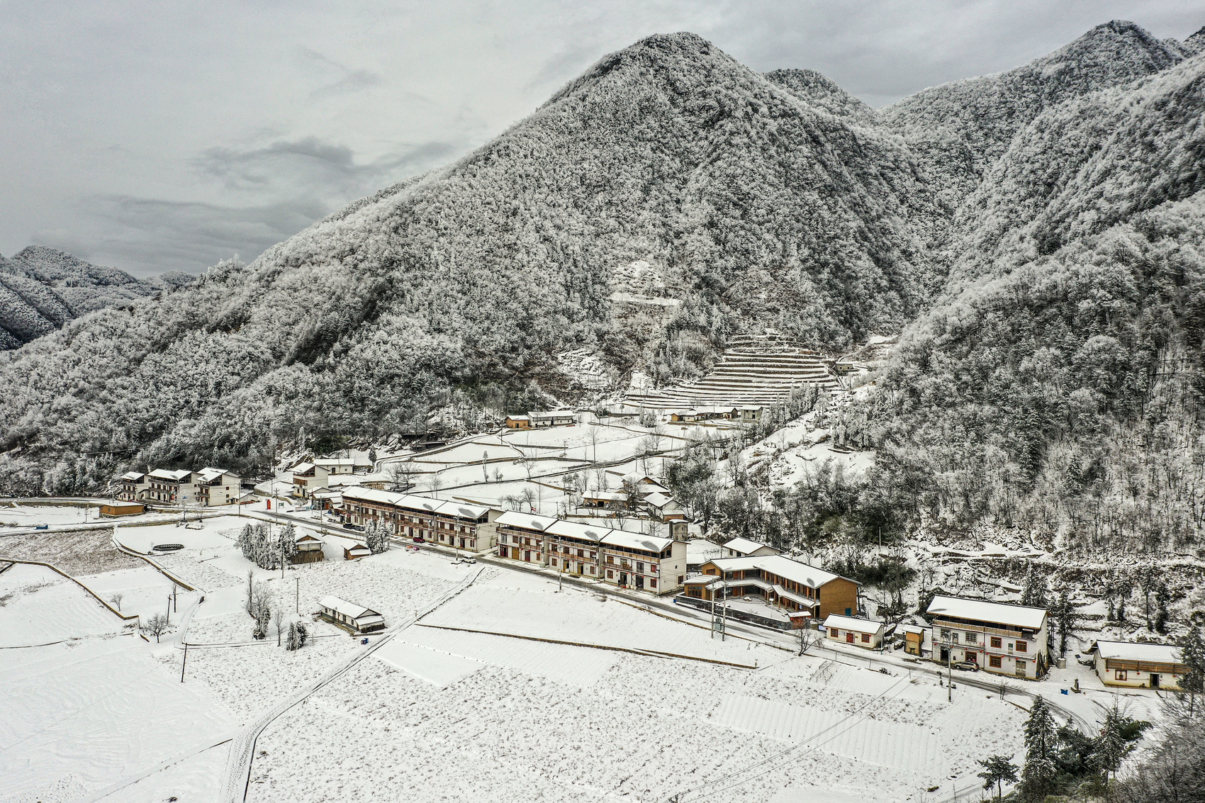 这是1月24日拍摄的重庆市巫山县竹贤乡石院村一带雪后风光景色(无人机照片)。