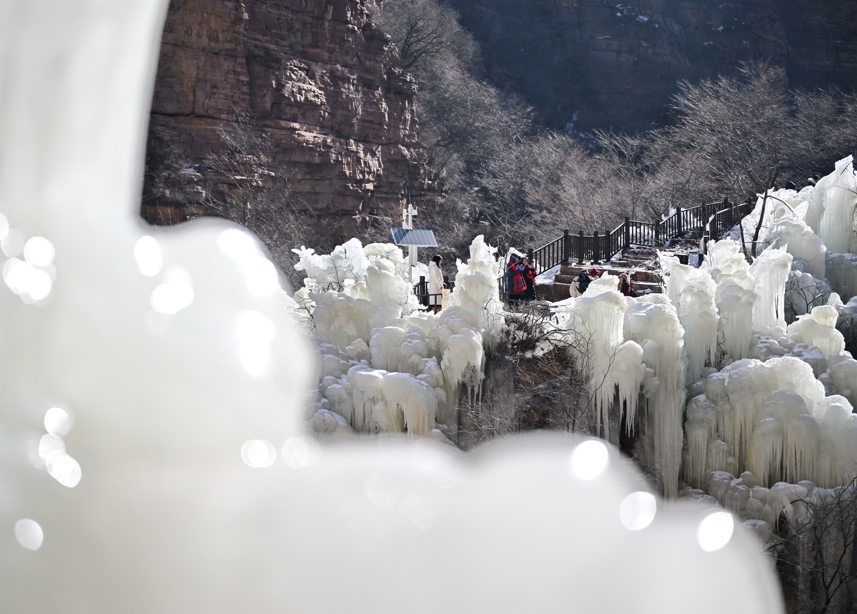 寒冬时节,河北省石家庄市赞皇县嶂石岩景区冻凌背瀑布出现冰瀑美景,形态各异的冰柱悬挂在山间,吸引不少游客前来观赏。
