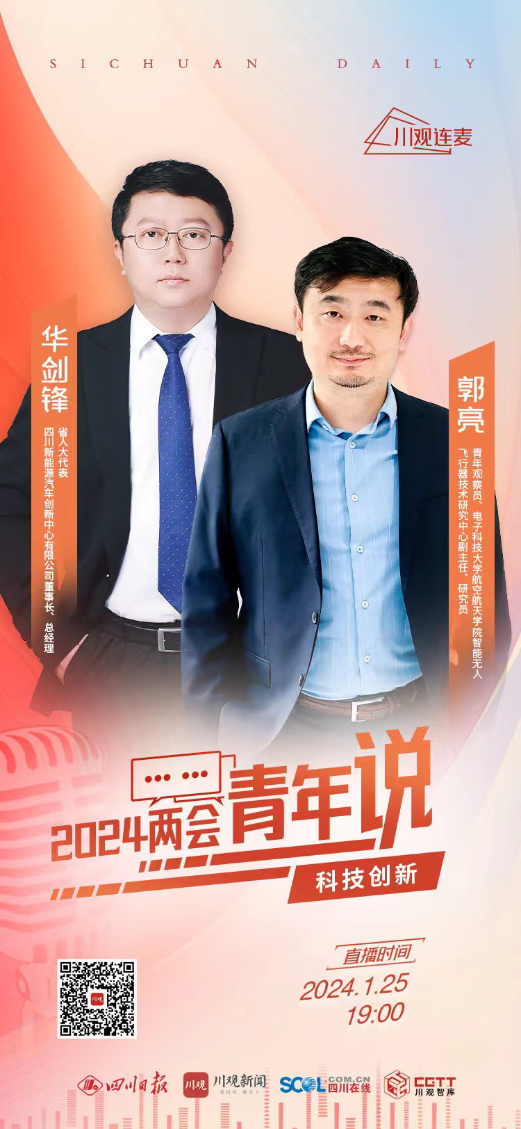 1月25日,2024年省两会特别报道·两会连麦系列直播——“2024两会青年说”最后一期直播聚焦“科技创新”主题,省人大代表,四川新能源汽车创新中心有限公司董事长、总经理华剑锋,以及青年观察员、电子科技大学航空航天学院智能无人飞行器技术研究中心副主任、研究员郭亮一起做客直播间。