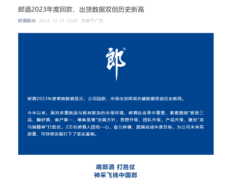 2023年,郎酒年度营销数据显示,公司汇款、市场出货两项关键数据双创历史新高,这是郎酒在“后两百亿时代”交出的第一份答卷。2万名郎酒人在2023年坚定极致三品、酿好酒,实现思想、团队、产品的三大升级,为2024年及未来郎酒的可持续发展奠定了扎实基础。