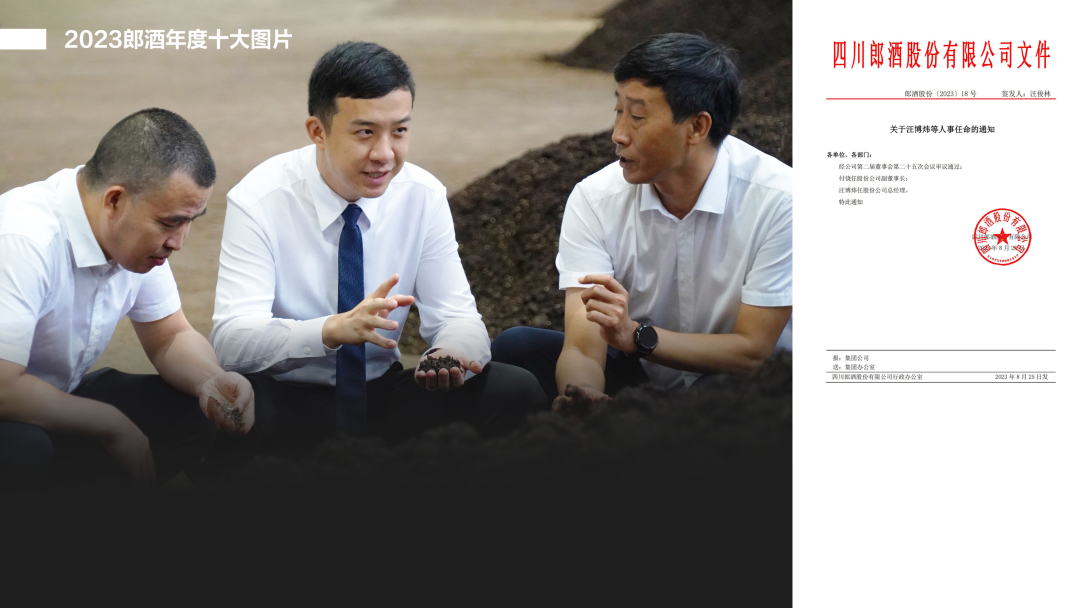 2023年8月25日,郎酒股份发布通知,经郎酒股份公司第二届董事会第二十五次会议审议通过,汪博炜出任郎酒股份公司总经理。郎酒正在朝着更加年轻化、专业化、知识化的方向迈进。一个守正创新的郎酒、一个勇攀高峰的郎酒、一个青春洋溢的郎酒,正在赤水河左岸冉冉升起。