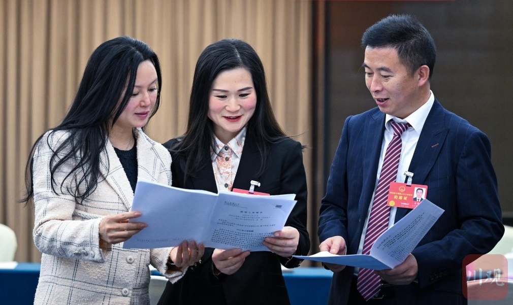 张福鑫代表(中)建议,推进生态文明建设和绿色低碳发展,继续推进安宁河谷生态走廊建设,不断提升巴山蜀水颜值。
