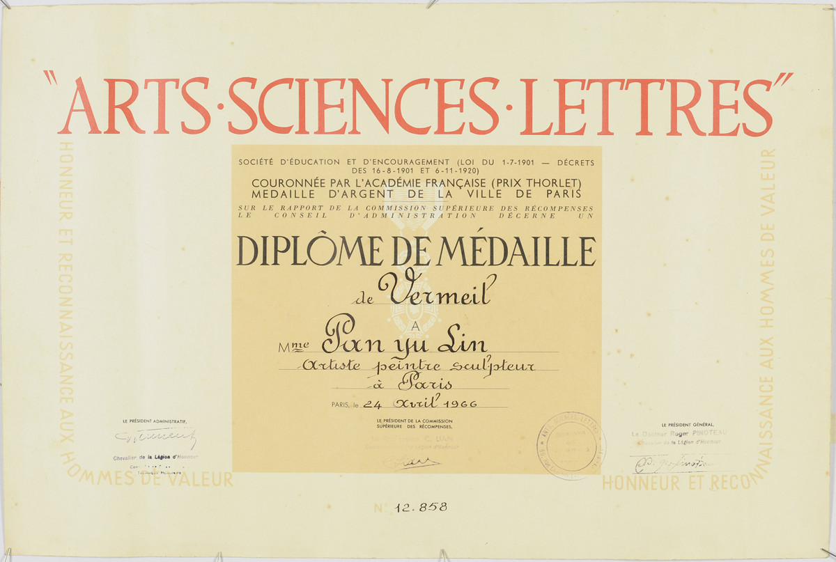 1966年“艺术、科学、文学促进会”颁给潘玉良的银质奖证书。